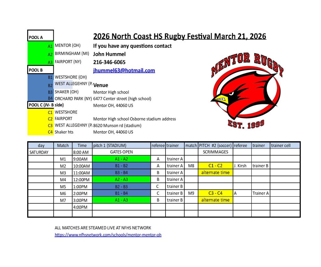 The Northcoast High School Rugby Festival organizer has released the schedule for the day. We play at 9 a.m. against Mentor High School (the host team) and Fairport at 12 noon. This means…